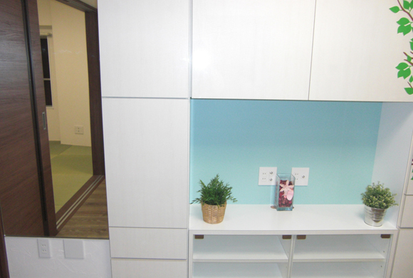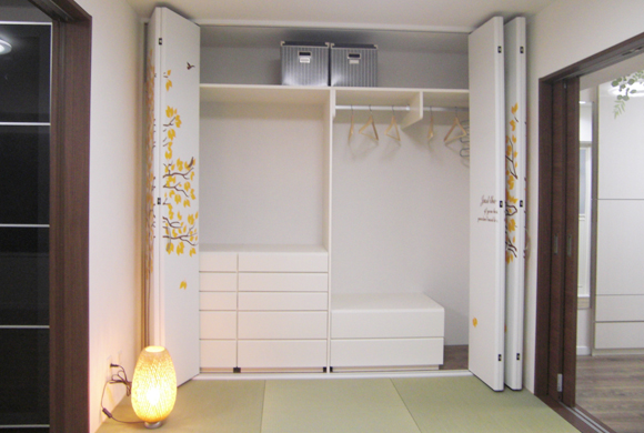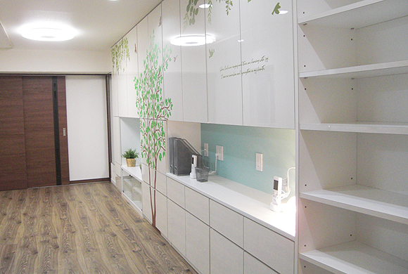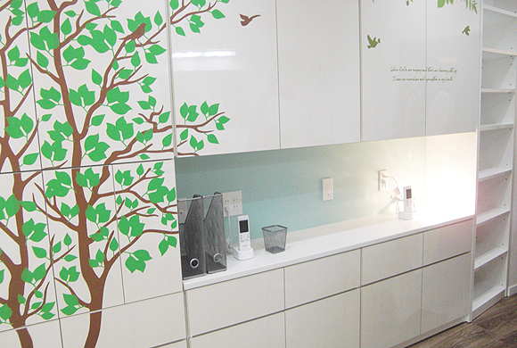 この壁面収納には衣類以外の物を隈無く収納できるように設計されており、表面の樹木のシートは明るい雰囲気をイメージしてデザインしました。