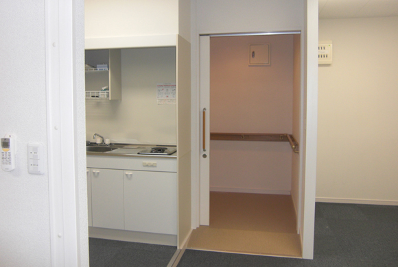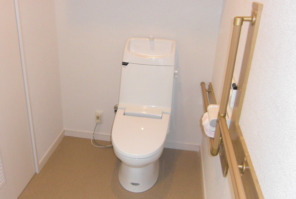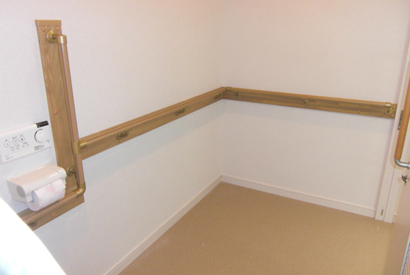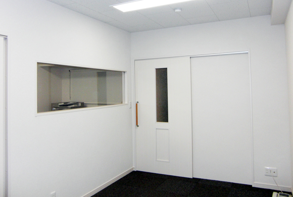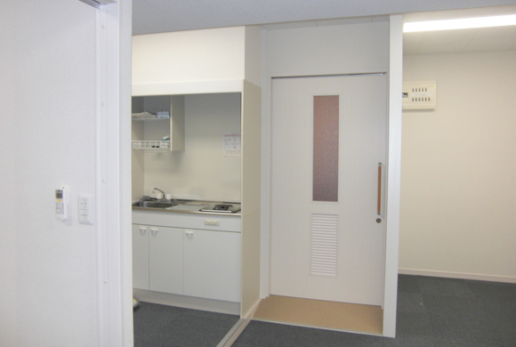 賃貸・居抜き利用物件での介護関係(事務所)の改修依頼にお応えして、車イスでも入れる仕様に変更しました。段差解消のスロープ、トイレスペースの拡大(手摺りの設置)など、建具に関しては全て巾広タイプの引戸を設置しております。