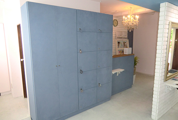 コンクリートの質感を残した白の浸透性カラー材、白のブリックタイルにポイントで青と茶を使用し、清潔感がある空間の中にもレトロな雰囲気を出しています。