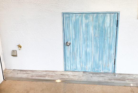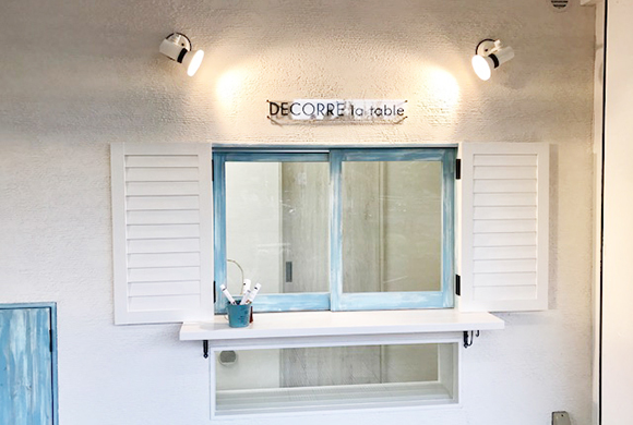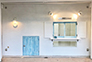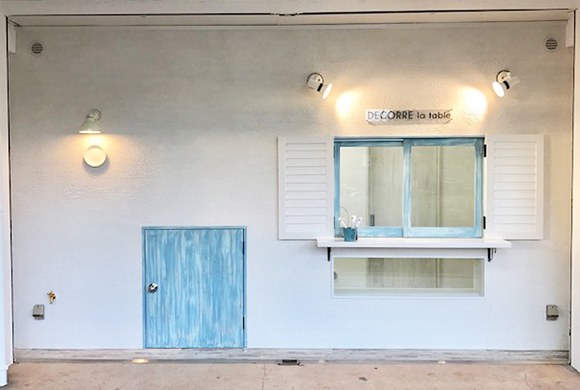 ファサードは白塗り壁メインベースに社のイメージカラー水色を各扉にエイジング塗装。